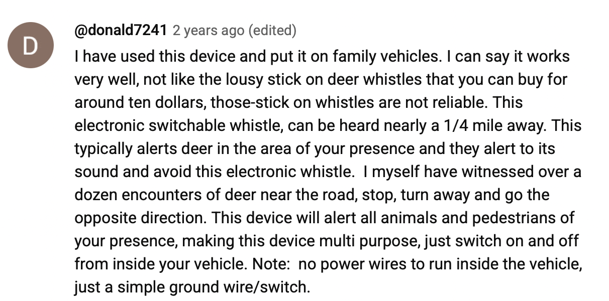 Having been involved in 8 deer collisions – I did come across an honest review on this product. Living in upstate New York there are deer everywhere and the amount of driving I do the odds are stacked. I installed the first one in my service truck 3 years ago. It’s amazing the way the deer will hear it and acknowledge. I have not had another incident and that’s driving in whitetail country everyday and 180k since the last. Because I have seen such excellent results- my suv, my wife’s car, my daughter’s car all have the hornet. Excellent product